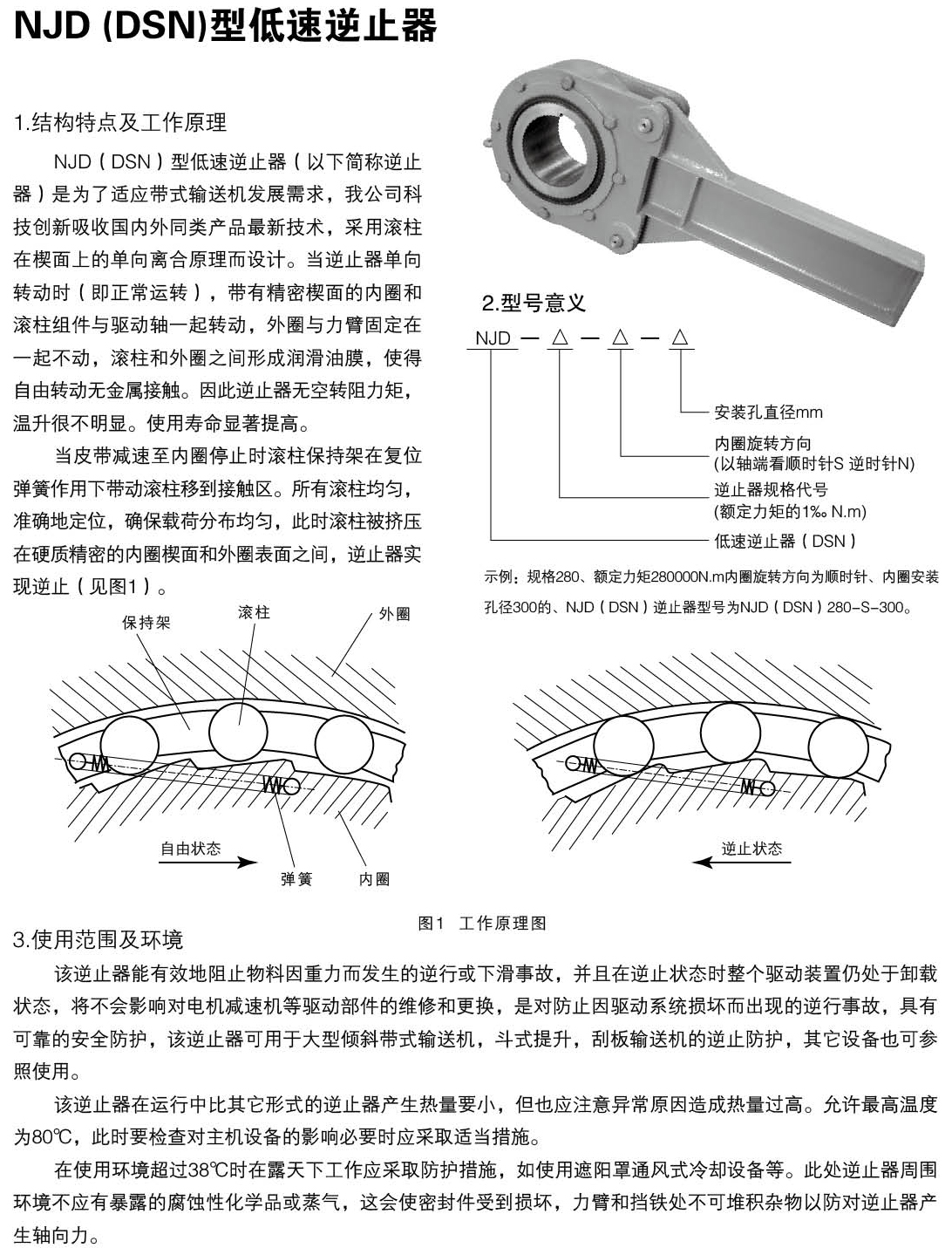 NJD(DSN)型低速逆止器(以下簡(jiǎn)稱逆止器)是為了適應(yīng)帶式輸送機(jī)發(fā)展需求,眾誠(chéng)公司科技創(chuàng)新吸收國(guó)內(nèi)外同類產(chǎn)品最新技術(shù),采用滾柱在楔面上的單向離合原理而設(shè)計(jì)。當(dāng)逆止器單向轉(zhuǎn)動(dòng)時(shí)(即正常運(yùn)轉(zhuǎn)),帶有精密楔面的內(nèi)圈和滾柱組件與驅(qū)動(dòng)軸一起轉(zhuǎn)動(dòng),外圈與力臂固定在一起不動(dòng),滾柱和外圈之間形成潤(rùn)滑油膜,使得自由轉(zhuǎn)動(dòng)無(wú)金屬接觸。因此逆止器無(wú)空轉(zhuǎn)阻力矩,溫升很不明顯。使用壽命顯著提高。